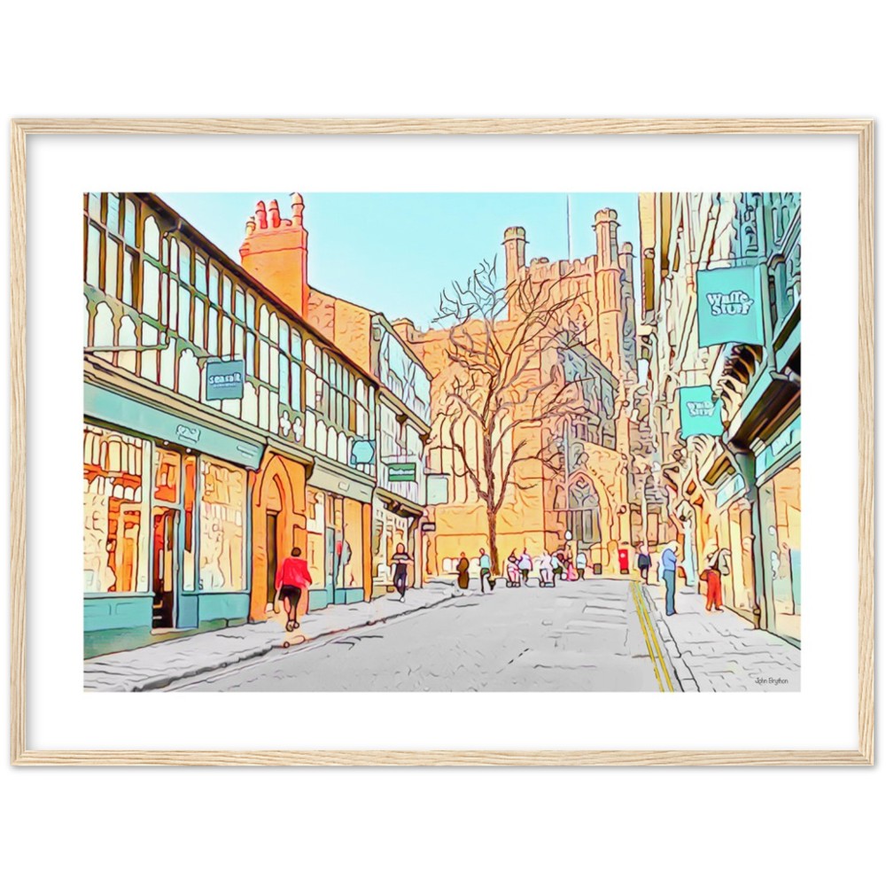 St Warburg h Street Chester, the street that leads to Chester Cathedral from Eastgate Street. A bright painting by John Brython set in a wooden frame.