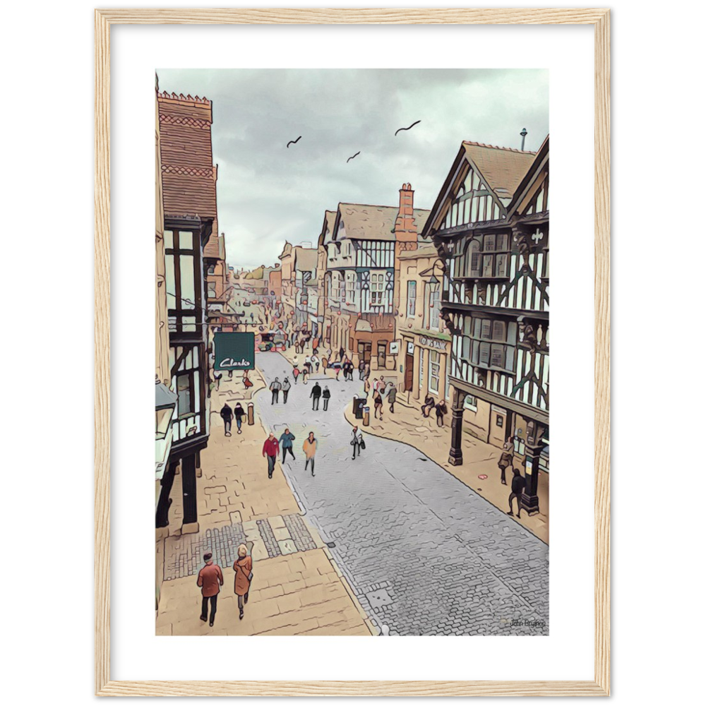 A view looking down Chester city centres Eastgate Street set an a beautiful wooden frame.
