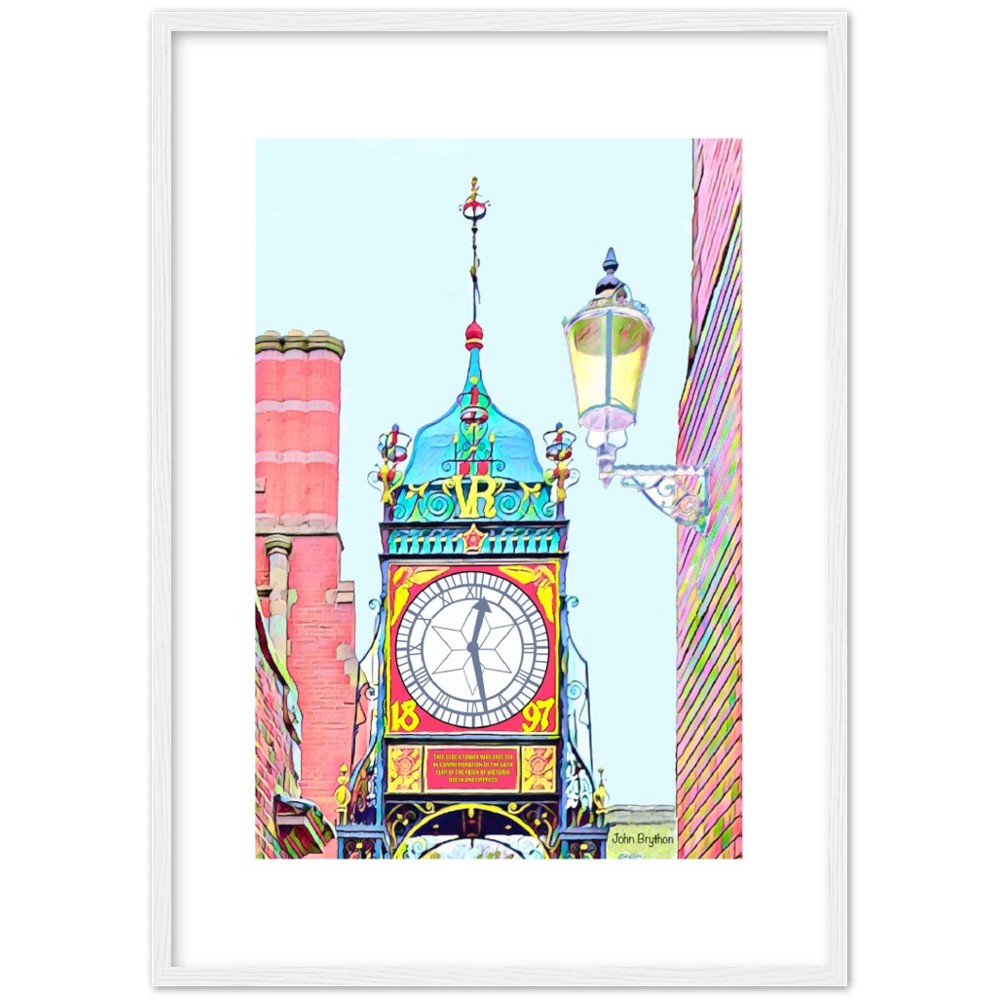 A framed print of Chester Eastgate clock by the artist John Brython. This artwork comes in various sizes and colours and would look great in any room
