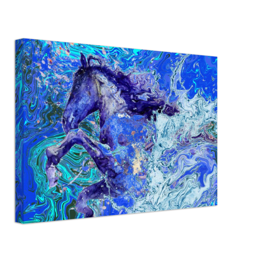 An abstract print by John Brython. A fleeing horse from a blue sea