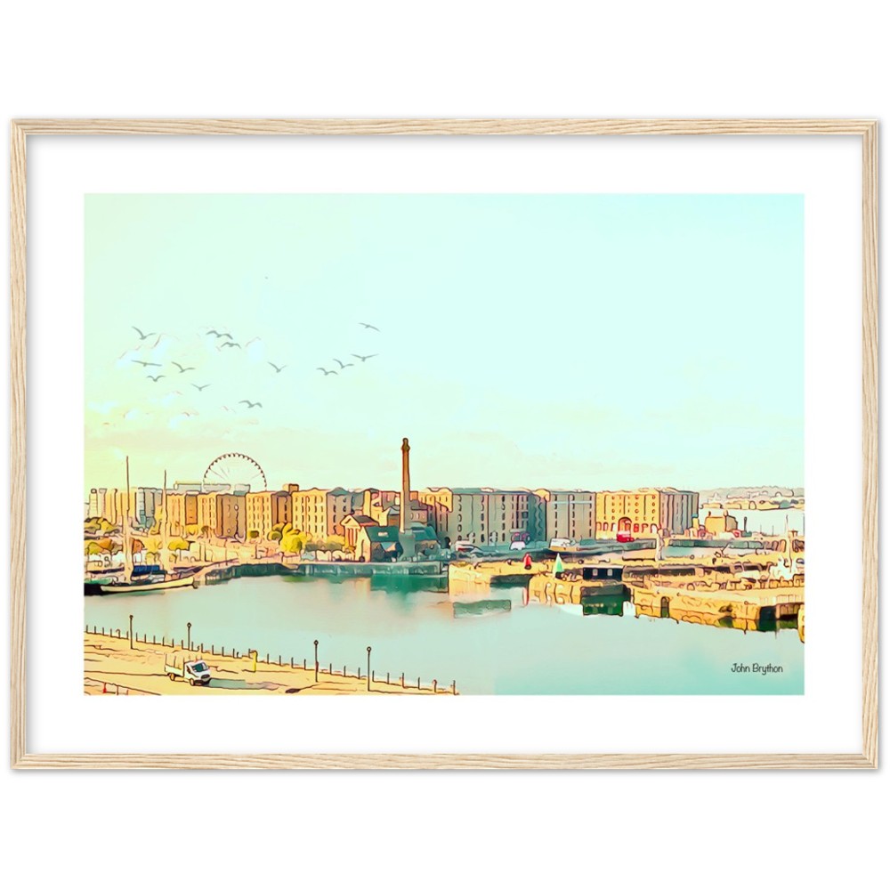 Bring a piece of Liverpool's rich maritime history into your home with this stunning framed art print of Salthouse Docks by artist John Brython. The print captures the beauty and serenity of the docks, with the calm waters reflecting the surrounding buildings and boats. The artwork is printed on high-quality paper using archival inks to ensure the colors remain vibrant for years to come. The print is then mounted in a sleek black frame, adding a touch of elegance to any room. Whether you're a Liverpool native or a lover of maritime history, this art print is sure to be a cherished addition to your collection