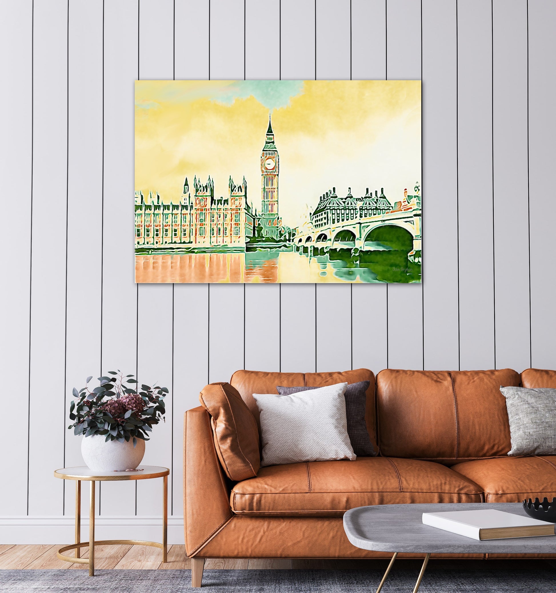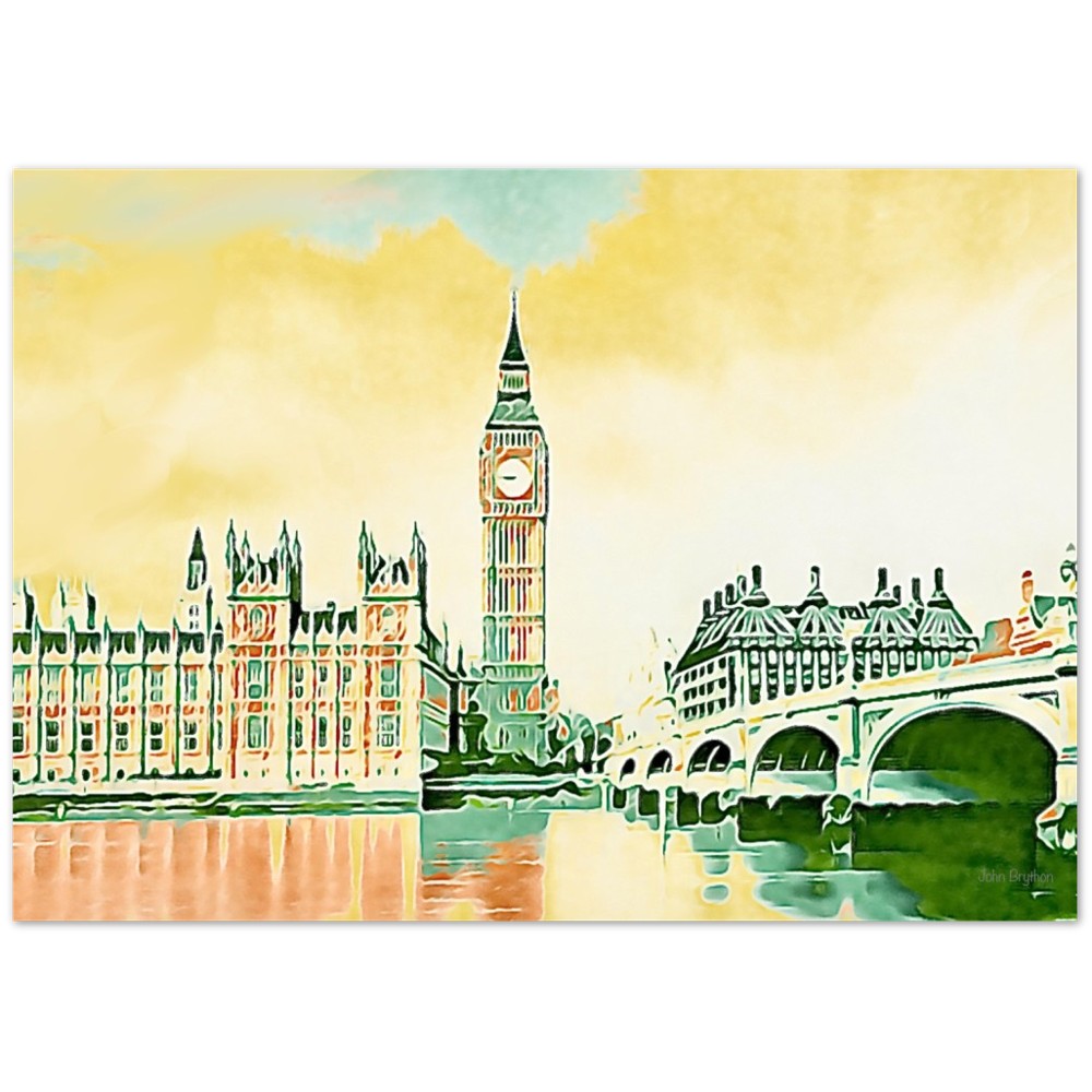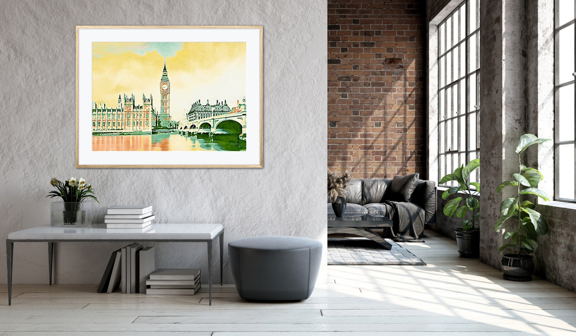 A print of the River Thames in Westminster with London Bridge in the foreground.