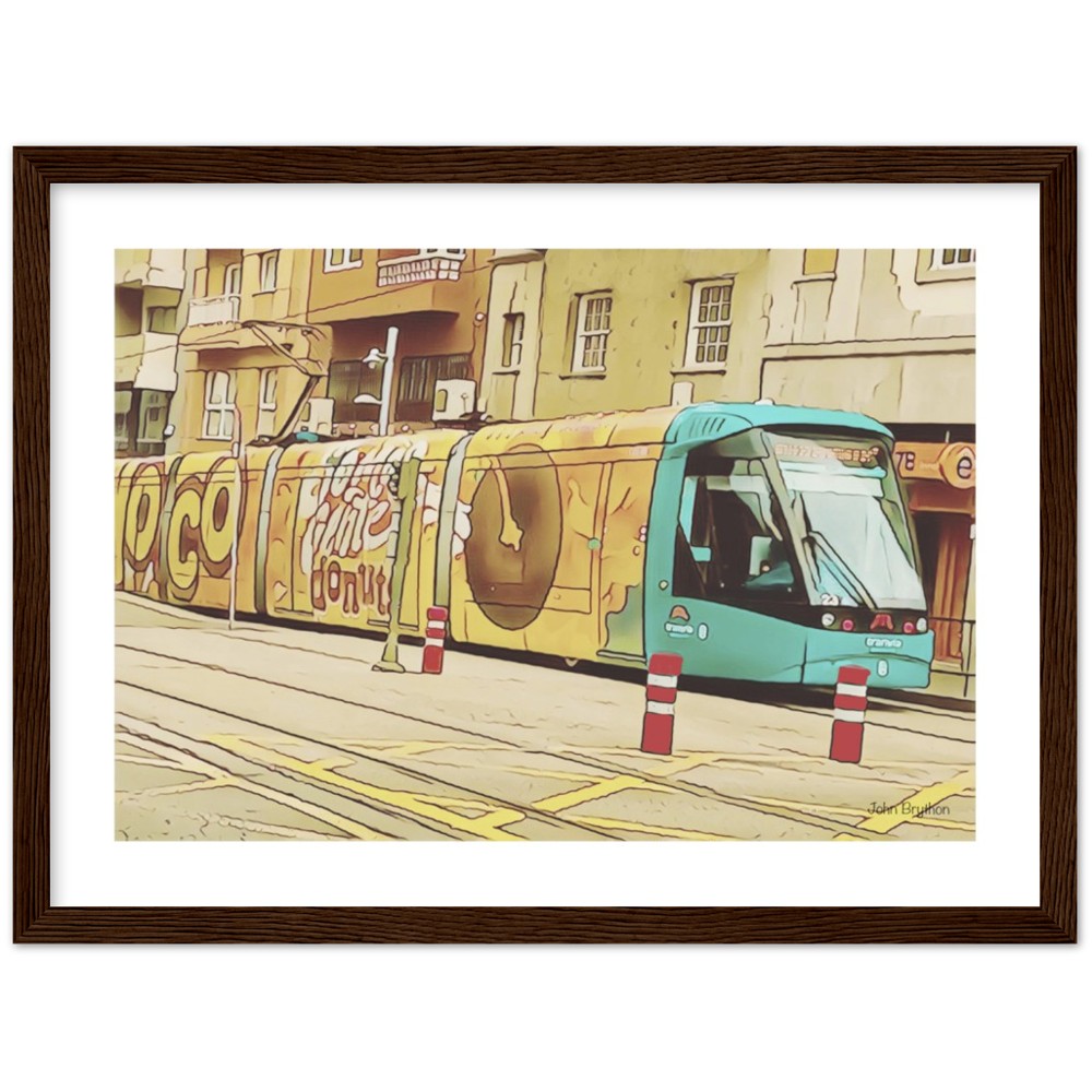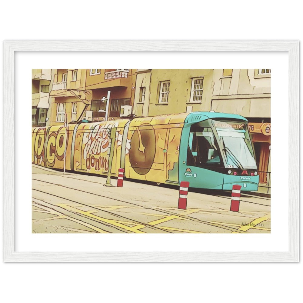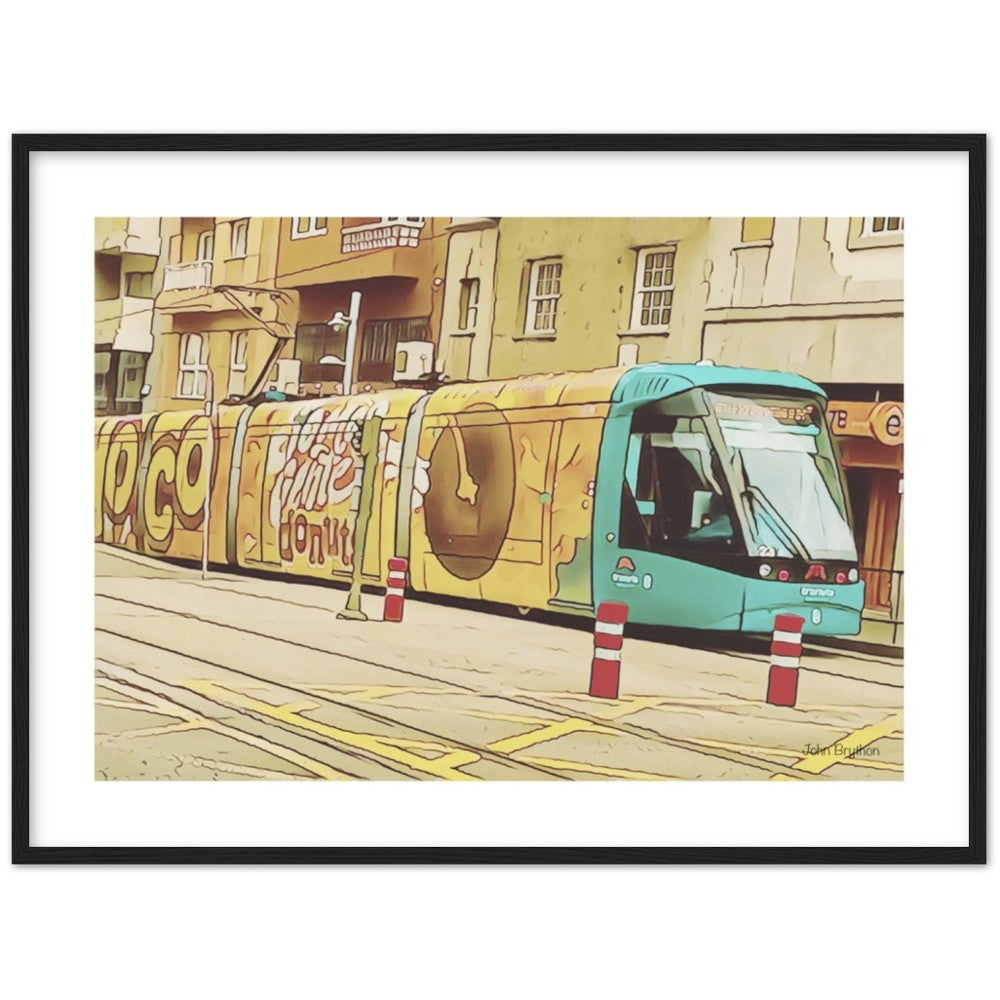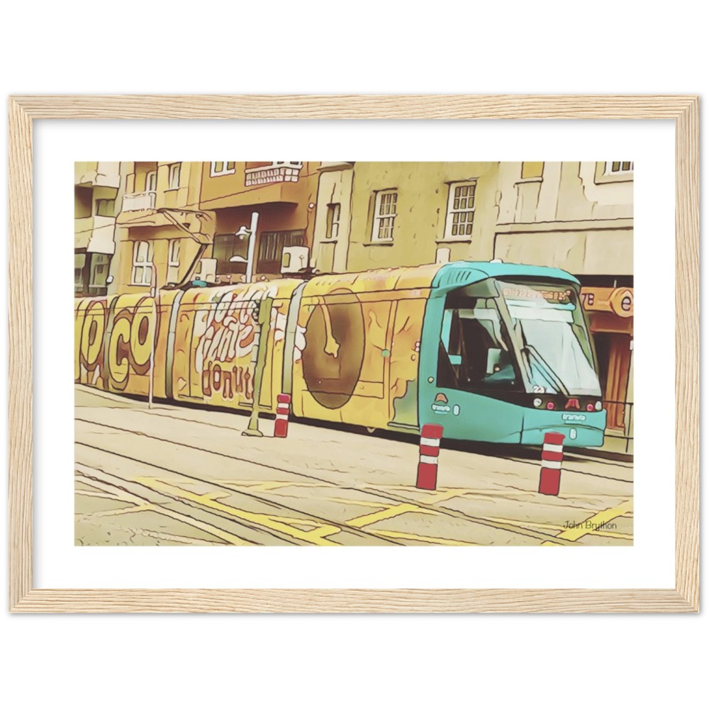 Yellow tram Print in. Wooden frame. Choose from a list of various colours and sizes.