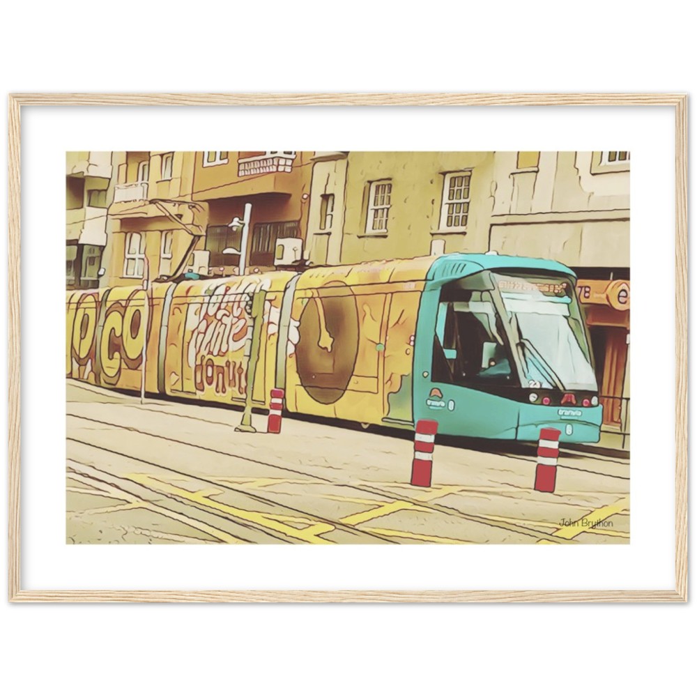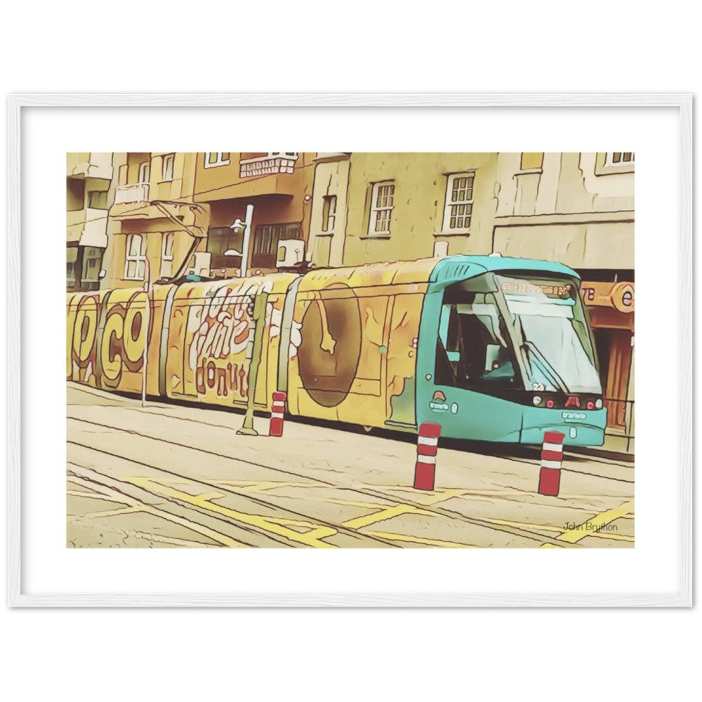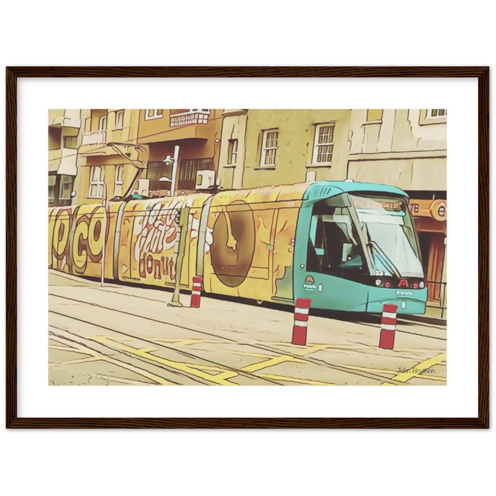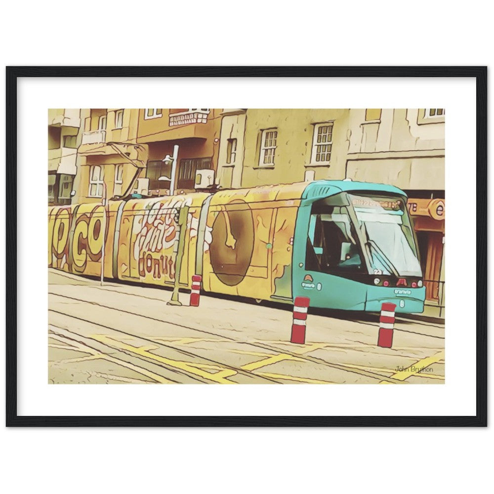 Yellow tram Print in. Wooden frame. Choose from a list of various colours and sizes.